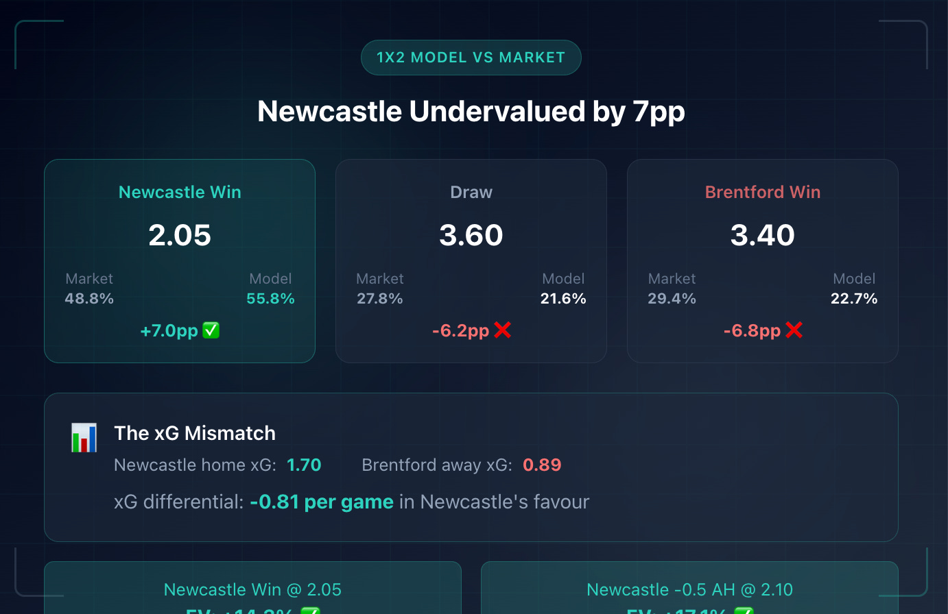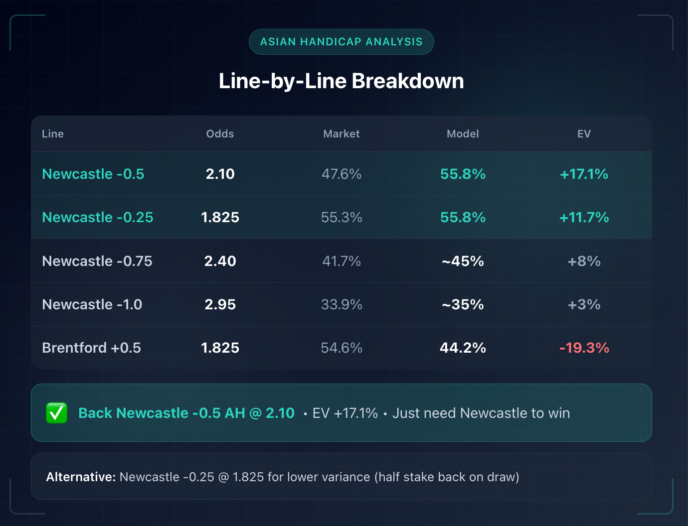 Newcastle -0.5 2.10 47.6% 55.8% +17.1% ✅ High Value