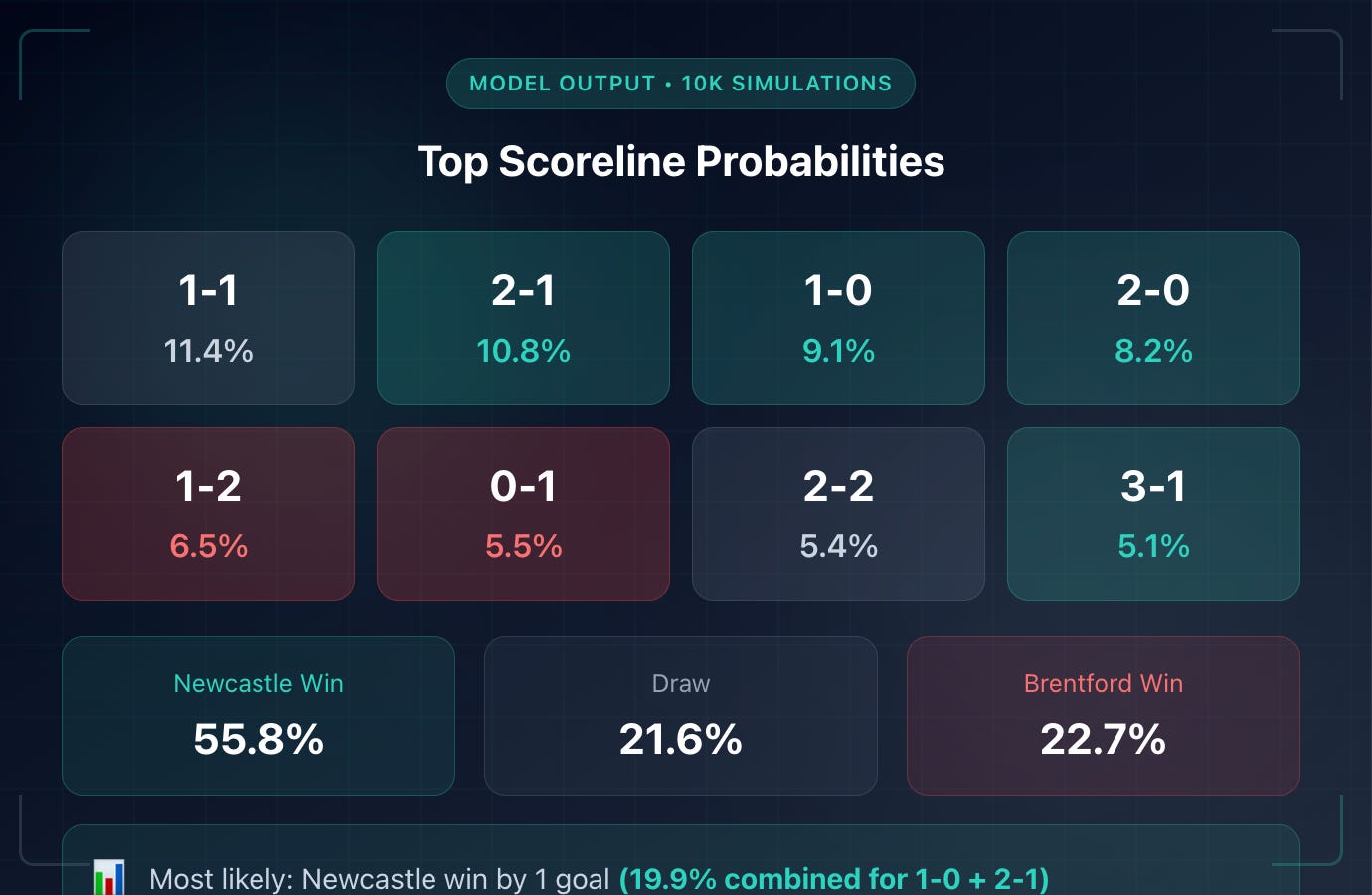 Most Likely Outcome: Newcastle win by 1 goal (combined 19.9% for 1-0, 2-1)