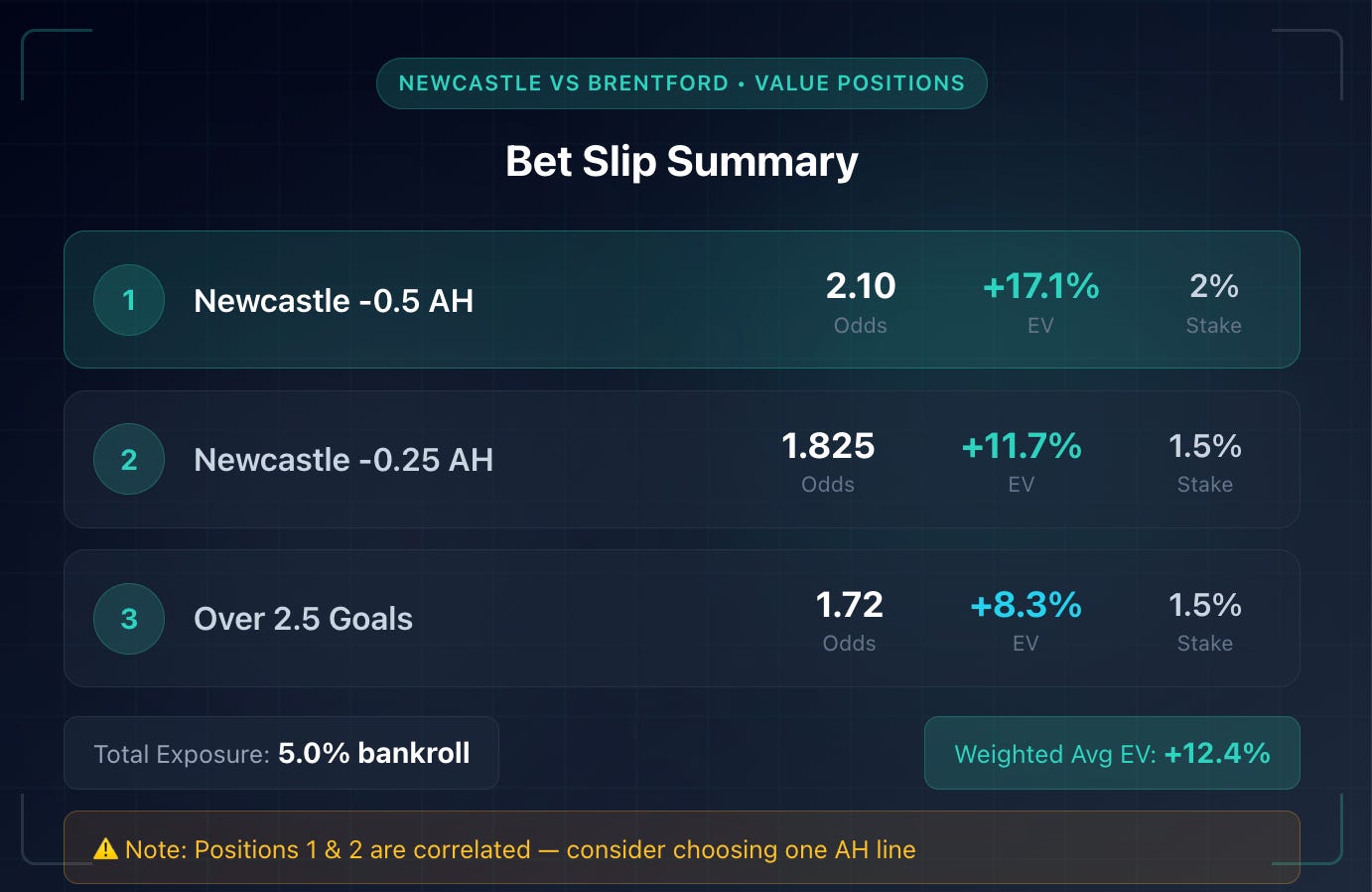 Note: Positions 1 and 2 are correlated (both need Newcastle win). Consider choosing one AH line rather than stacking both.