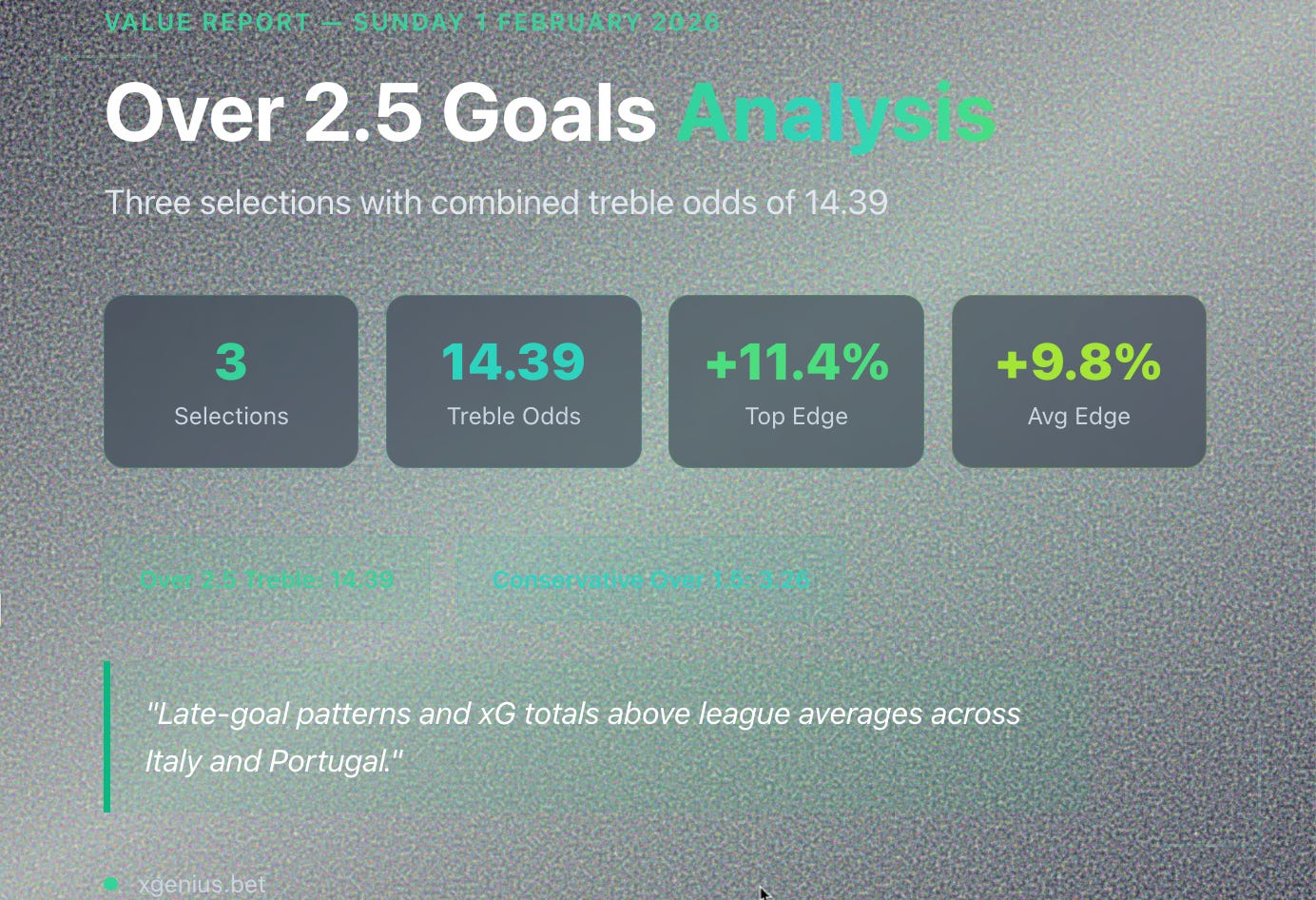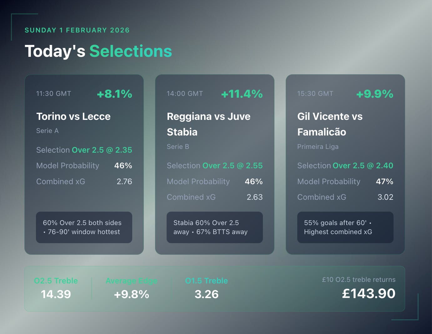 Three matches across Italy and Portugal have passed the model’s Over 2.5 goals threshold today. Combined odds of 14.39 on the treble, with edges ranging from +8.1% to +11.4%.