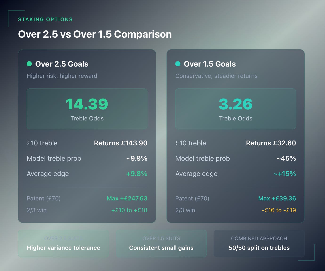 This balances the higher payout potential of Over 2.5 with the steadier strike rate of Over 1.5.
