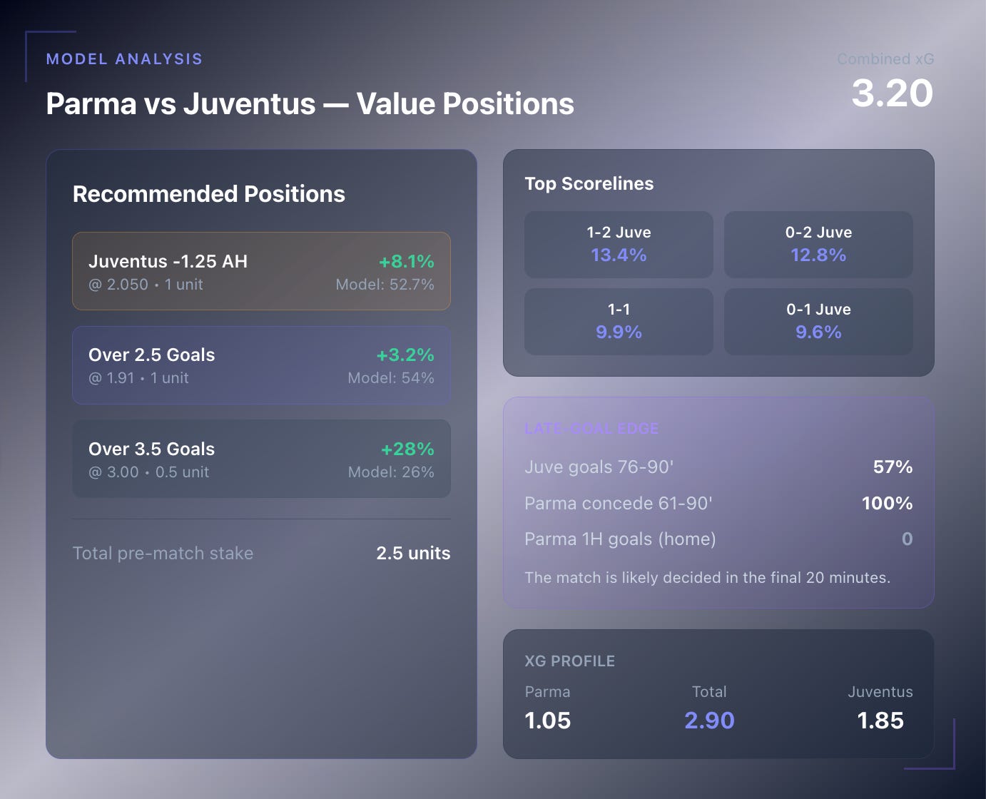 Why it works: Juventus’ away xG profile (1.75 for, 0.95 against) combined with Parma’s defensive vulnerability after 60’ creates conditions for multi-goal margins. The scoreline distribution shows 0-2 and 1-2 as the two most likely outcomes (combined 26.2%).