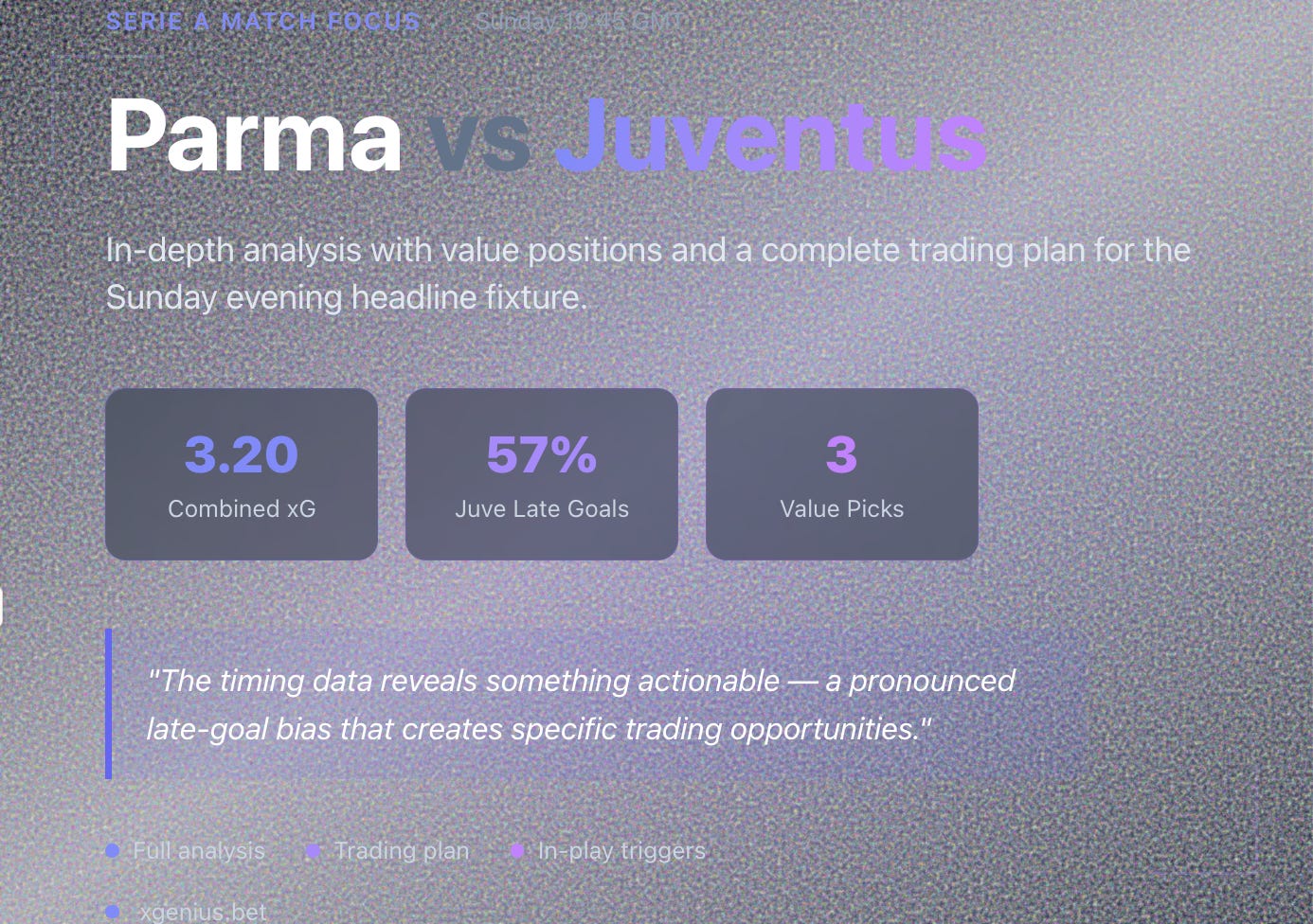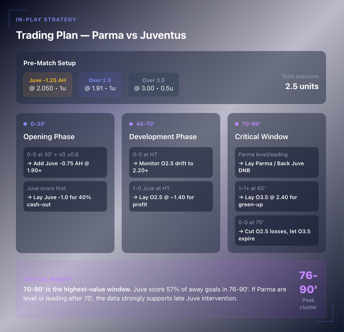 But raw form tells only part of the story. The timing data reveals something more actionable — a pronounced late-goal bias that creates specific trading opportunities. Juventus score the majority of their away goals in the final fifteen minutes. Parma concede every single goal after the hour mark.