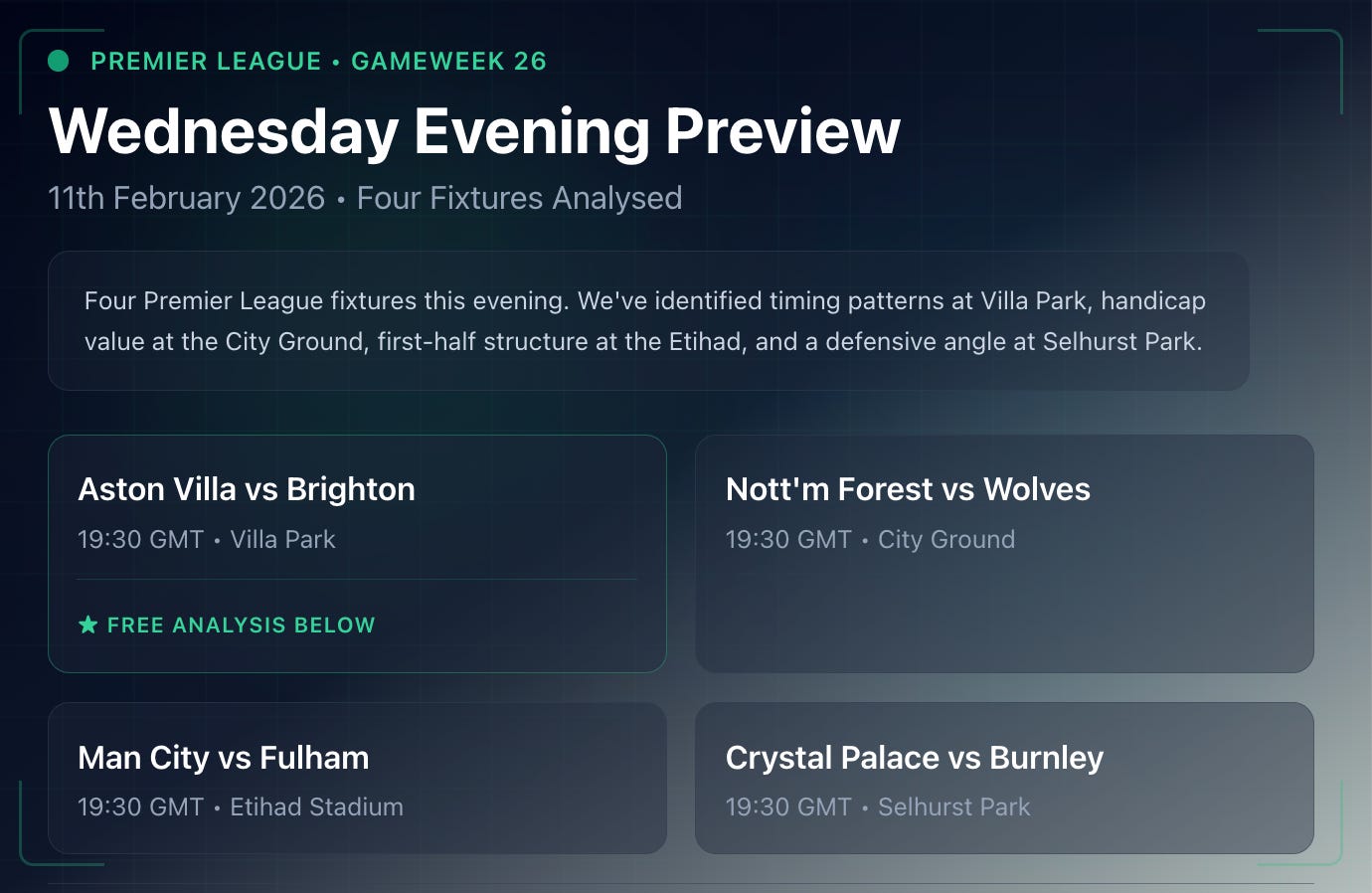 If yesterday’s free Everton vs Bournemouth analysis helped, tonight’s premium fixtures offer similar depth across all four matches. We have placed our focus on four of the Premier League fixtures this evening. We’ve run each through our Poisson model, cross-referenced with timing data, and identified where modest edges might exist against efficient markets.