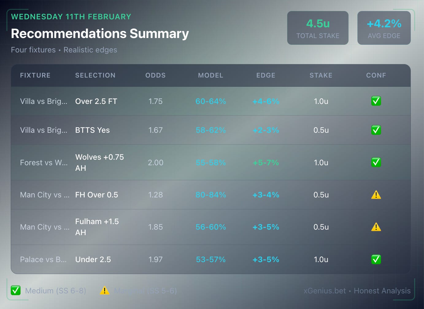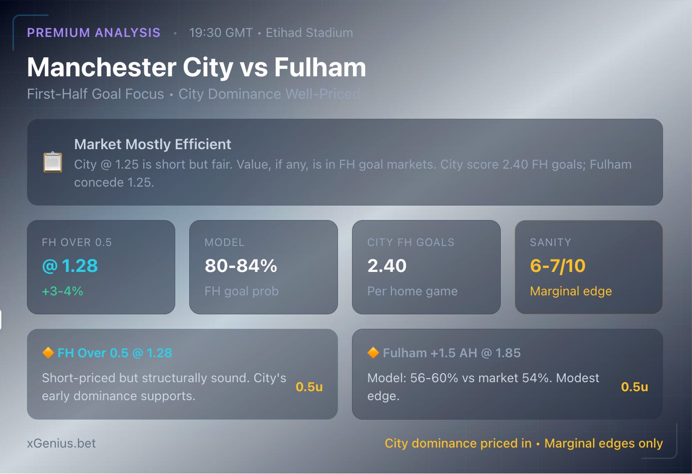 Note on FH Over 1.5: Raw model shows +14% but we down-weight to +4-6% due to market efficiency on City home games. FH Over 0.5 is the cleaner play.