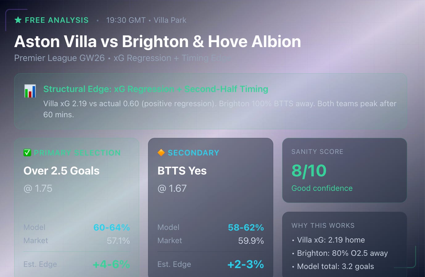 Why Over 2.5 stands out: Villa’s xG dominance (2.19 home) meets Brighton’s leaky away defence (1.9 xGA). Both teams show strong second-half trends — Villa 56% of goals after 60’, Brighton 67% after 45’.