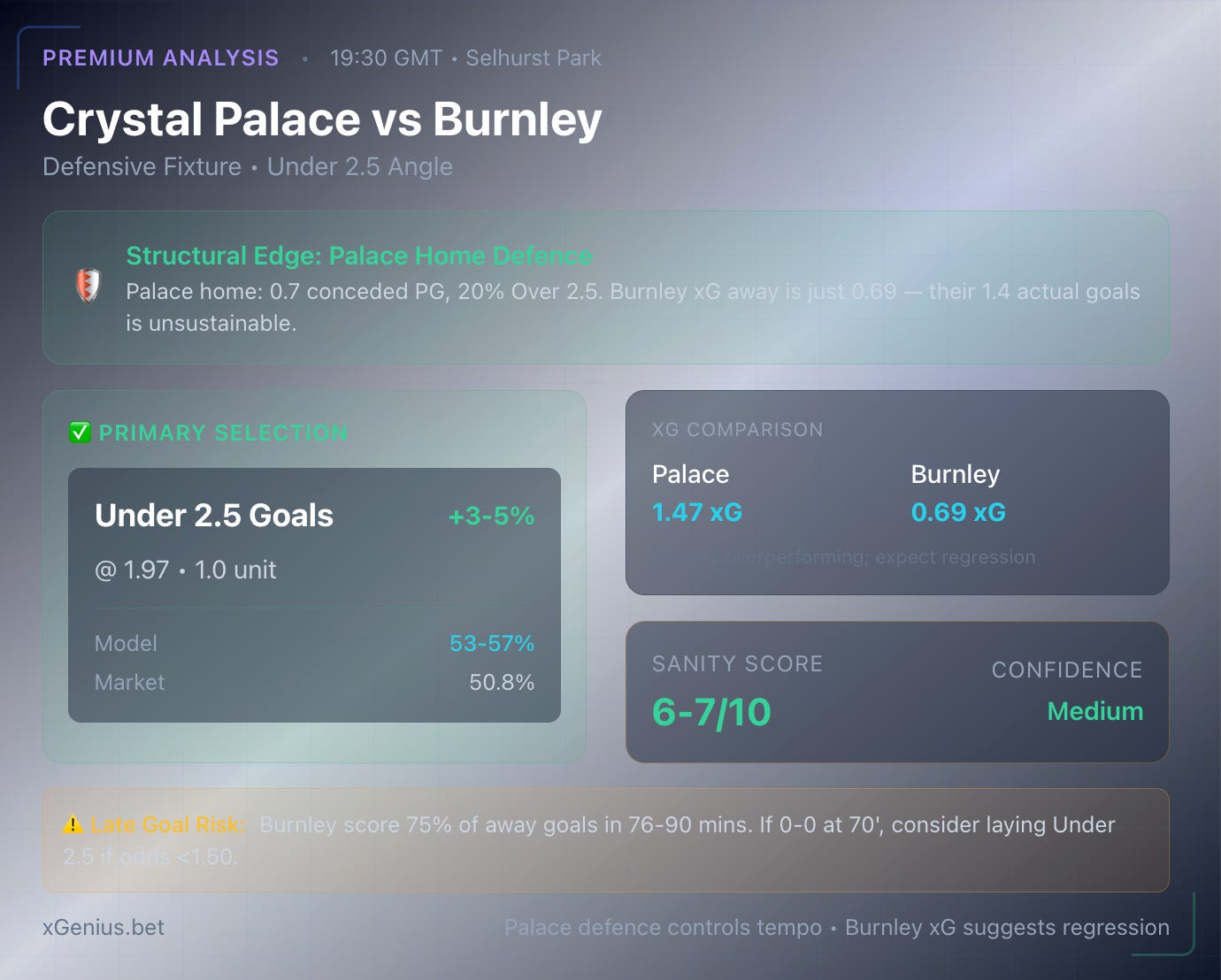 Palace’s home defensive solidity (0.7 conceded per game) should control tempo. Burnley’s xG (0.69 away) is poor despite high actual goals — expect regression toward fewer.