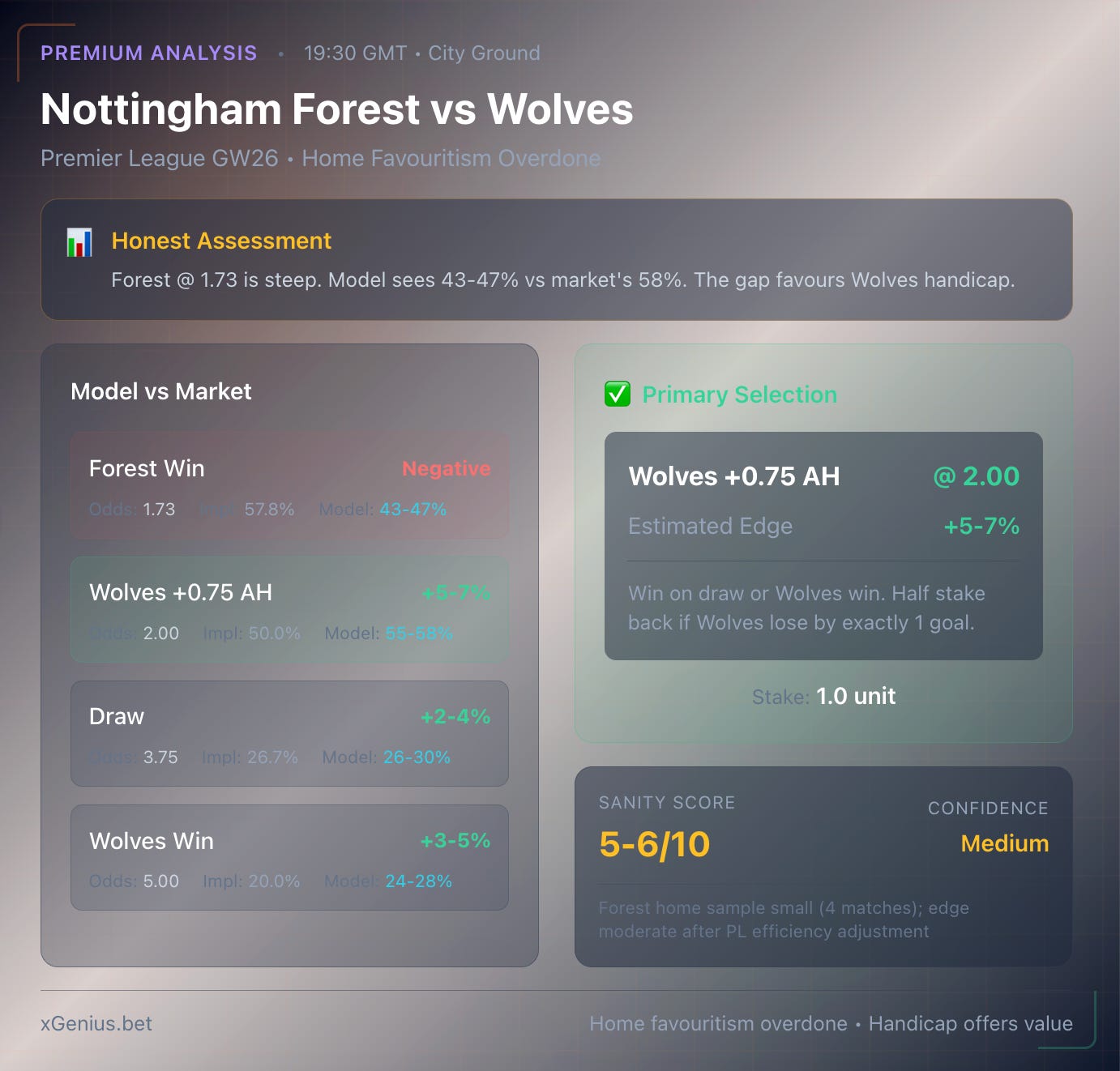 Market Odds Implied % Model Est. Edge Est. Verdict Forest Win 1.73 57.8% 43-47% Negative ❌ Avoid Wolves +0.75 AH 2.00 50.0% 55-58% +5-7% ✅ Value Draw 3.75 26.7% 26-30% +2-4% Fair Wolves Win 5.00 20.0% 24-28% +3-5% Marginal