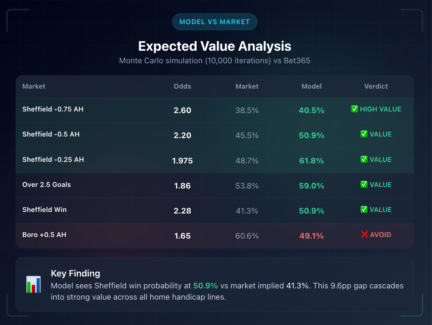Sheffield United’s home form (2.4 PPG, 80% win rate, 3.0 goals per game) meets Middlesbrough’s away vulnerability (60% loss rate, 1.8 goals conceded). The model identifies a 9.6pp probability gap on the match result that cascades into double-digit edges across handicap markets.