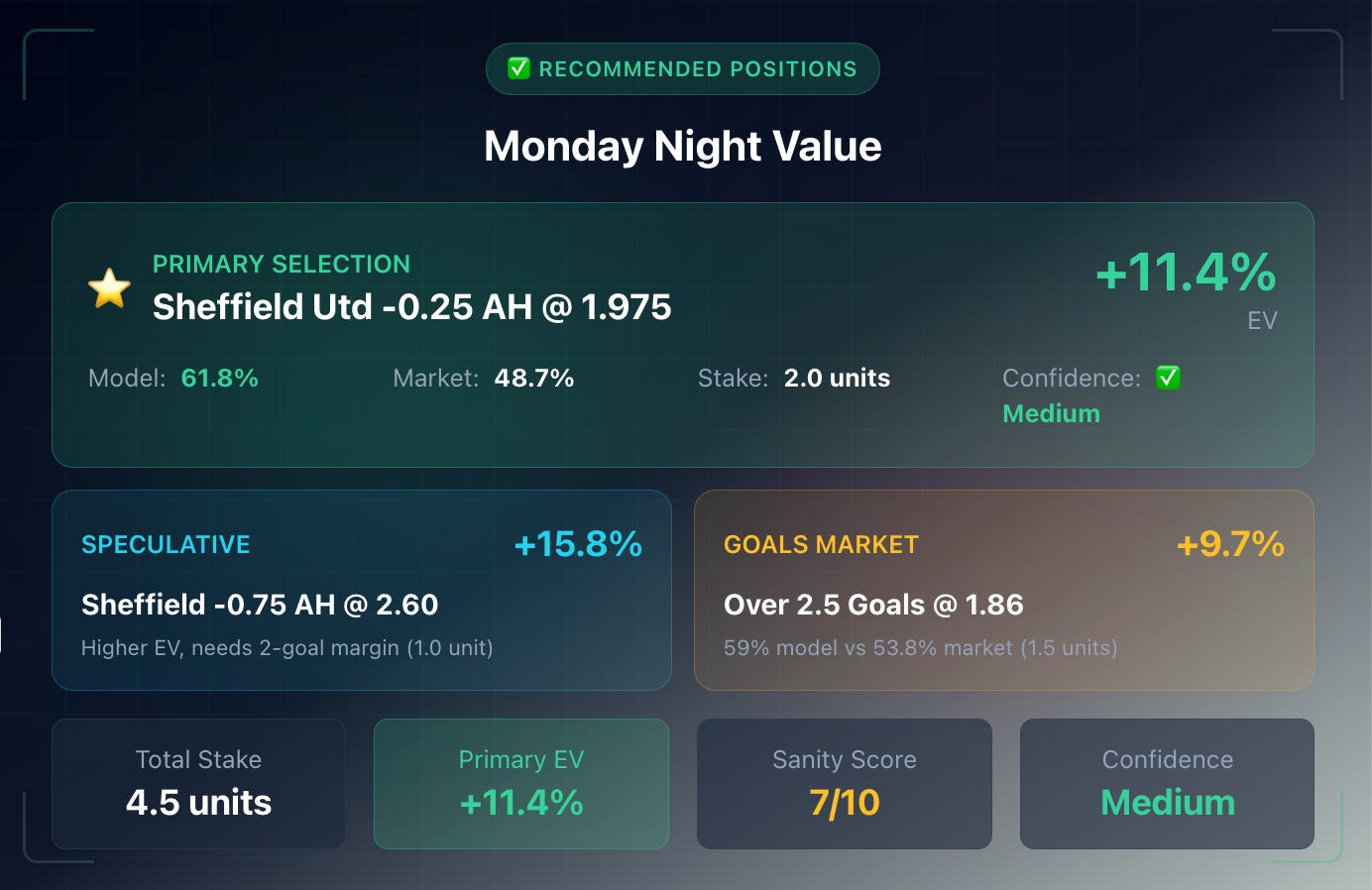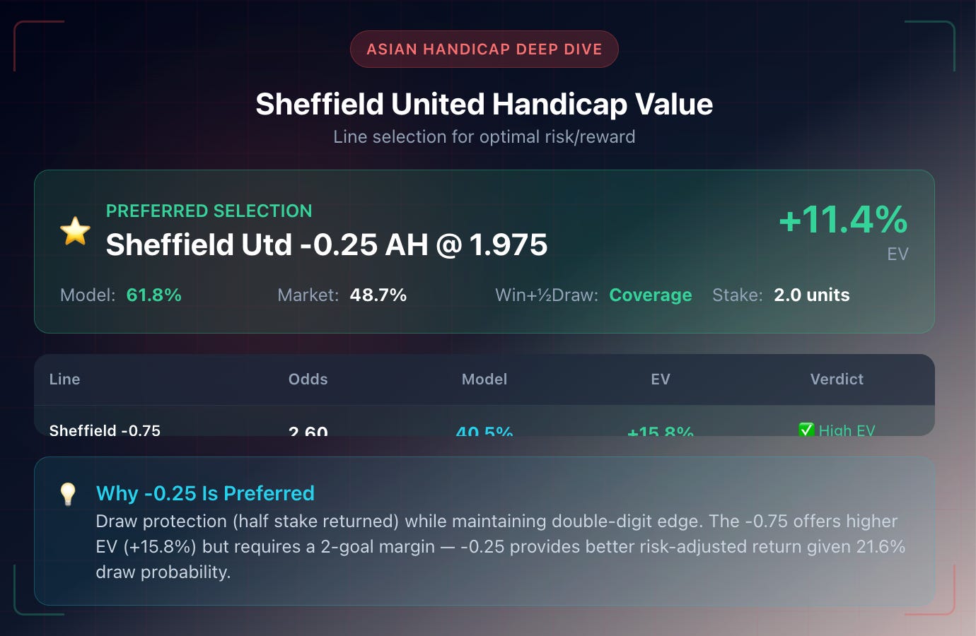 The -0.25 line at 1.975 offers the optimal balance — draw protection with +11.4% expected value. For those comfortable with higher variance, the -0.75 at 2.60 provides +15.8% EV but requires Sheffield to win by two.