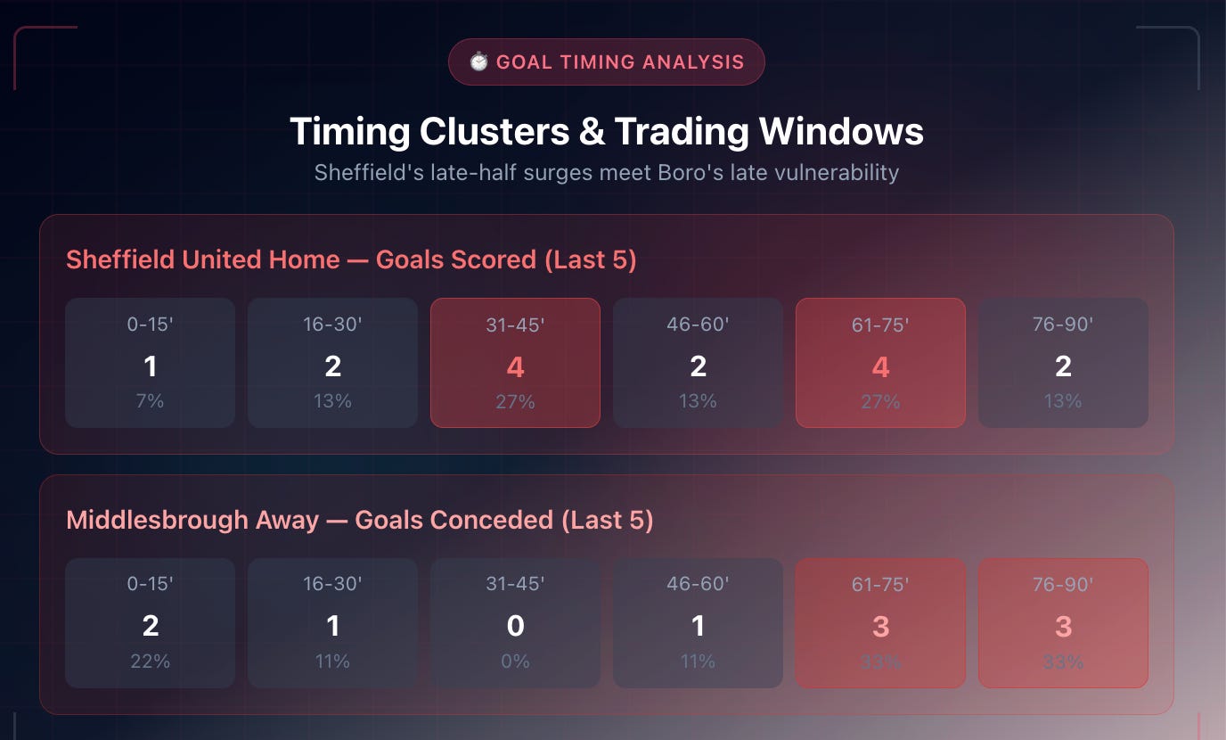 Strategic alignment: Sheffield’s 31-45’ and 61-75’ scoring clusters (54% of home goals) meet Boro’s 61-90’ defensive vulnerability (66% of away goals conceded). Late pressure is expected.