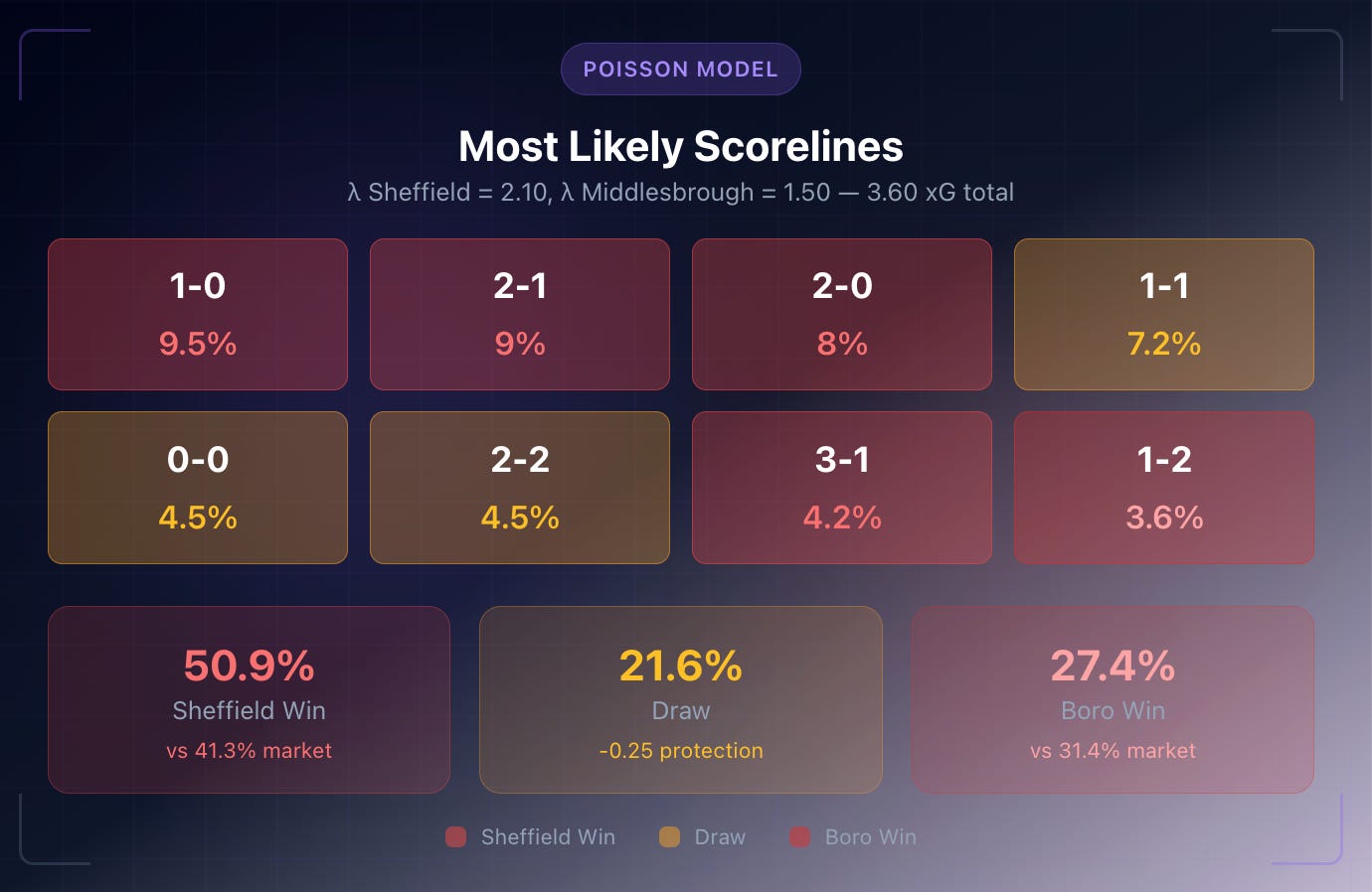 The xG differential here is significant. Sheffield’s home attack (1.93) against Boro’s away defence (1.47) creates an asymmetric matchup that the model exploits.