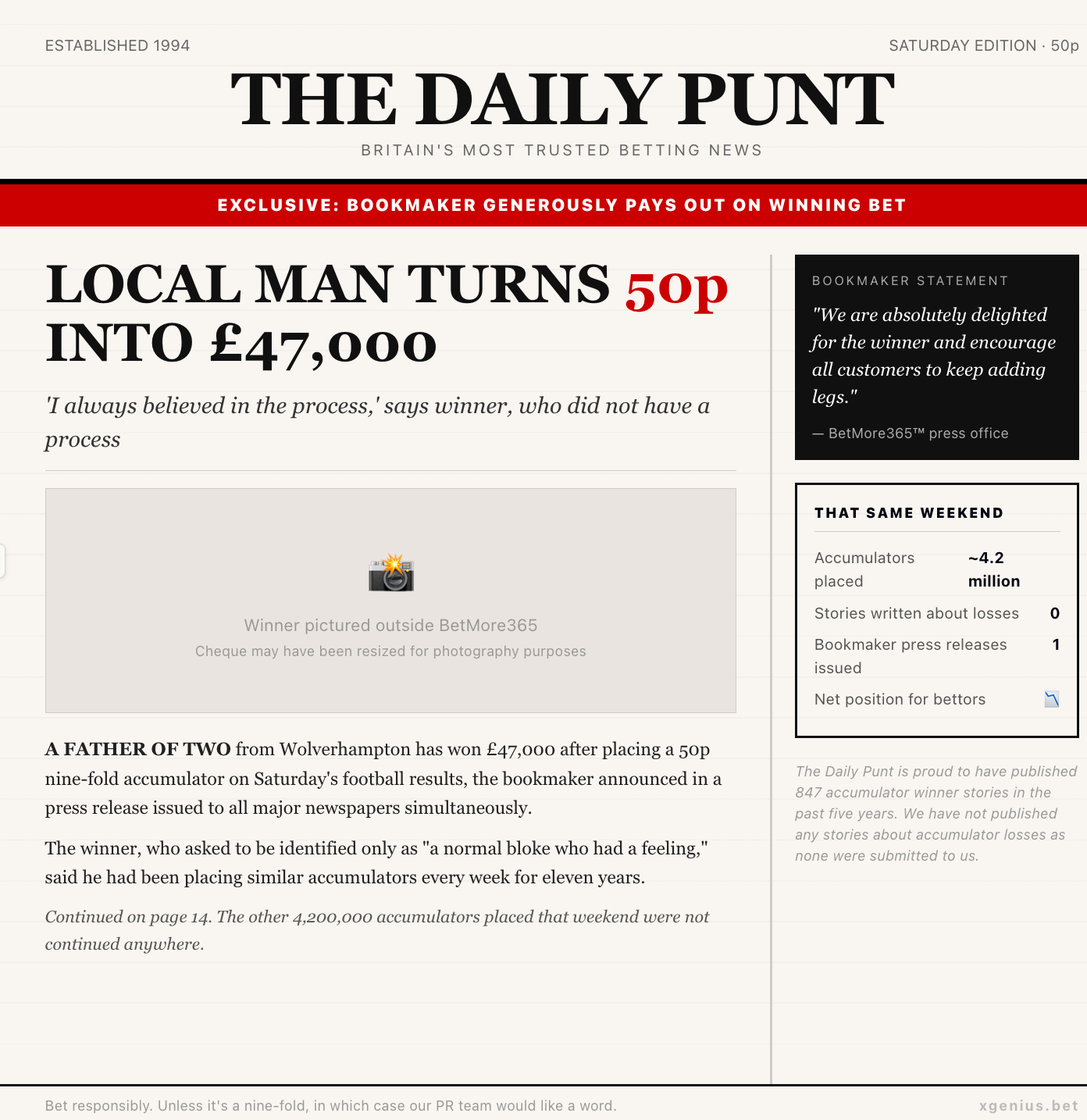This is survivorship bias weaponised as marketing. The tens of millions of accumulators that lost that same week do not get a press release. The people who put 50p on a nine-fold and got nothing back do not get photographed outside the bookmaker’s. They just quietly add up, week after week, into the revenue line that makes the £47,000 payout a rounding error.