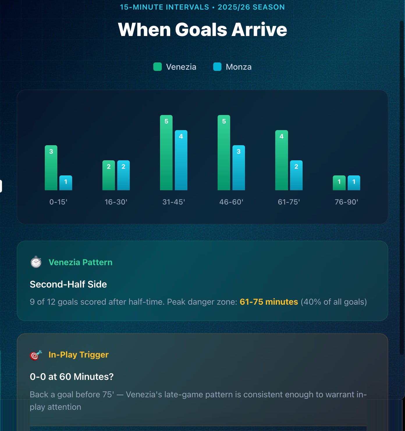 In-play watch: If 0-0 at 60 minutes, consider backing a goal before 75’ — Venezia’s timing patterns strongly favour this window.