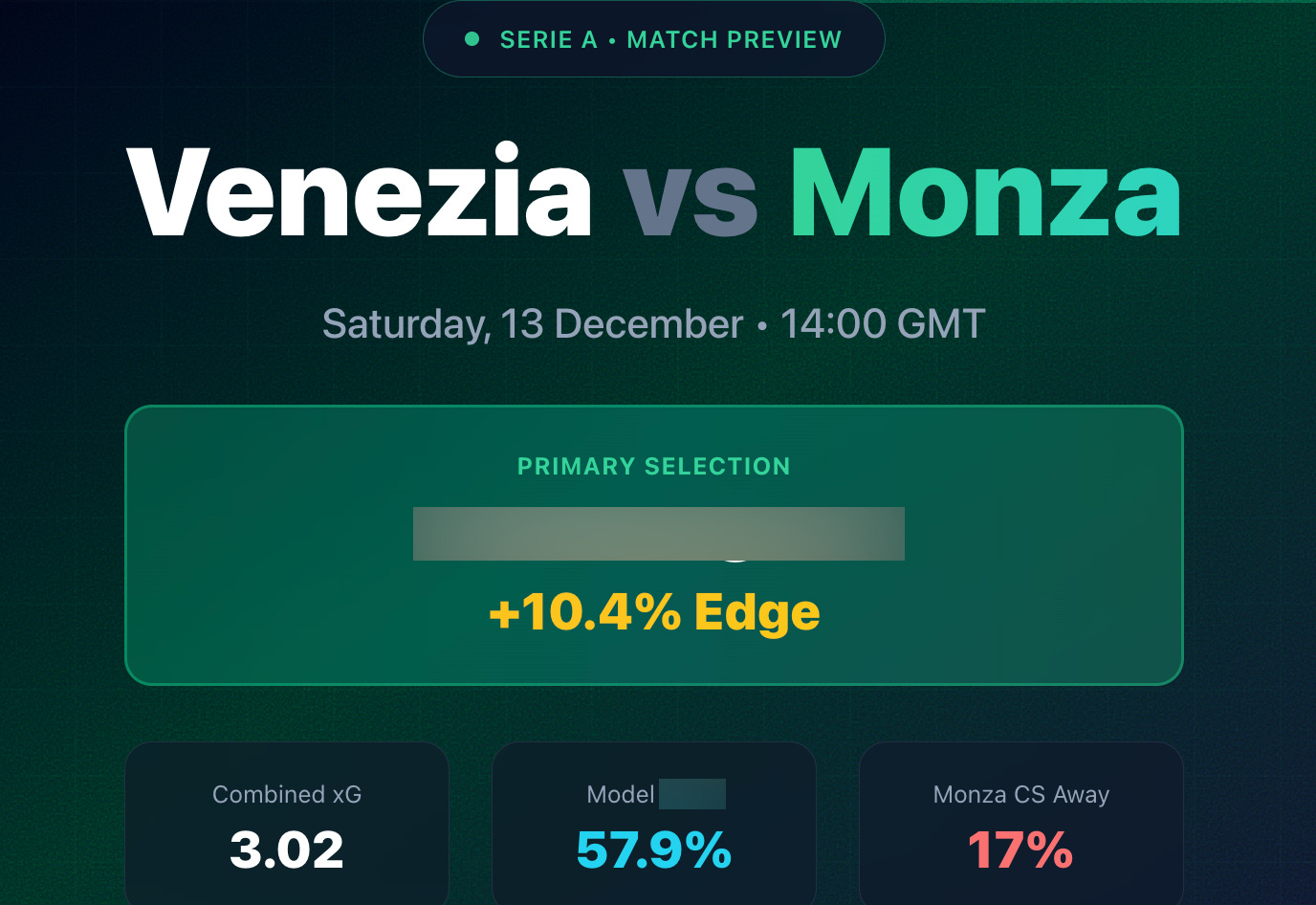 Venezia’s home form has been quietly solid defensively, while Monza continue to struggle on the road. The xG models point to goals — and the market appears to be underpricing the likelihood.