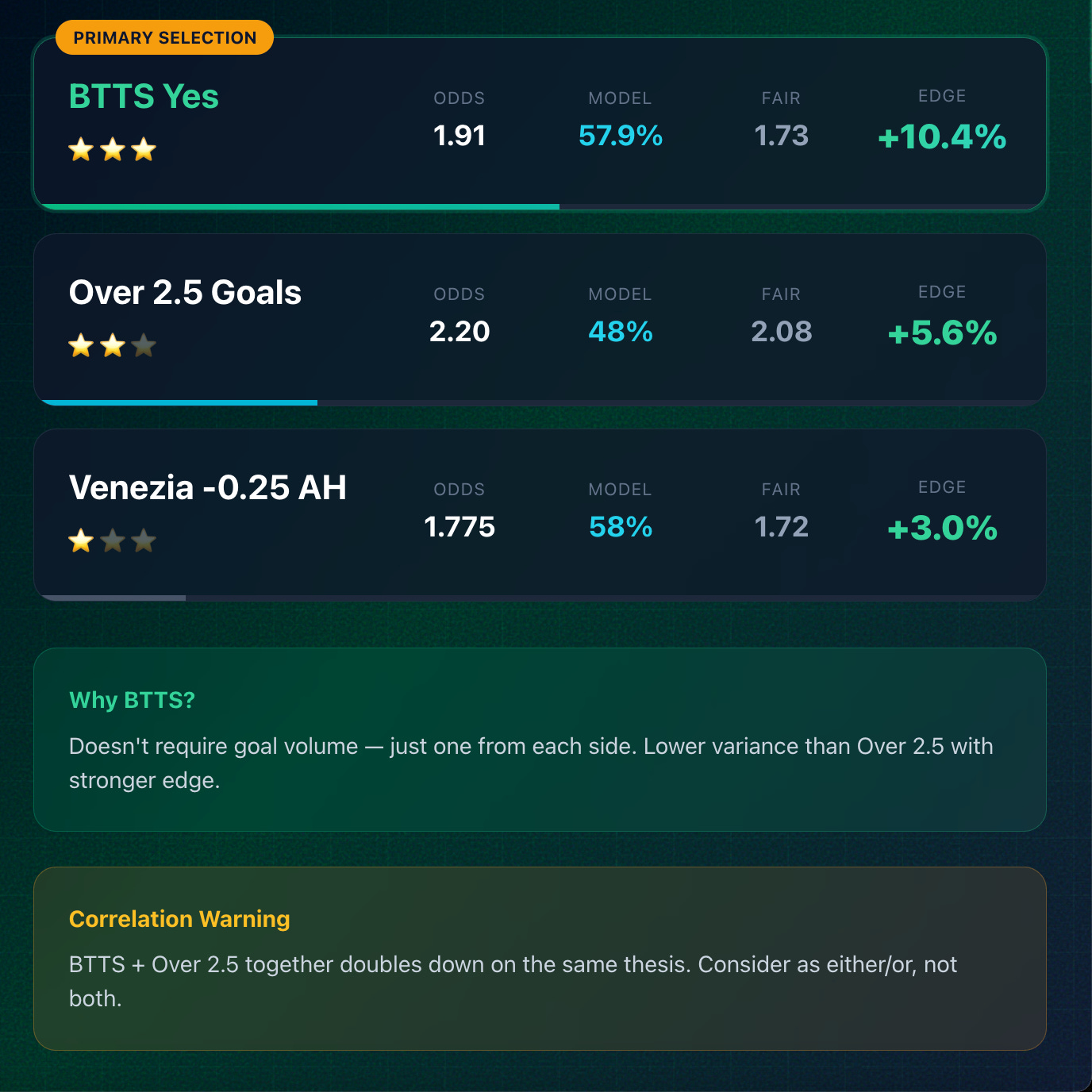 Secondary value: Over 2.5 at 2.20 offers marginal value, but we’ve tempered expectations given Venezia’s defensive home record. If you’re taking BTTS, adding Over 2.5 creates correlation risk — you’re essentially doubling down on the same thesis.