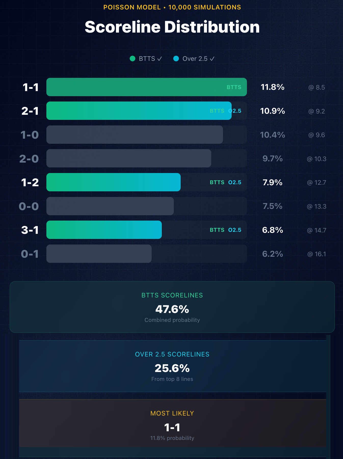 There’s still marginal value at 2.20 — the market implies 45.5% while we have it at 48% — but this comes with more variance. The BTTS thesis doesn’t require three goals; it only needs one from each side. Over 2.5 needs that extra goal to land, which makes it the riskier of the two selections.