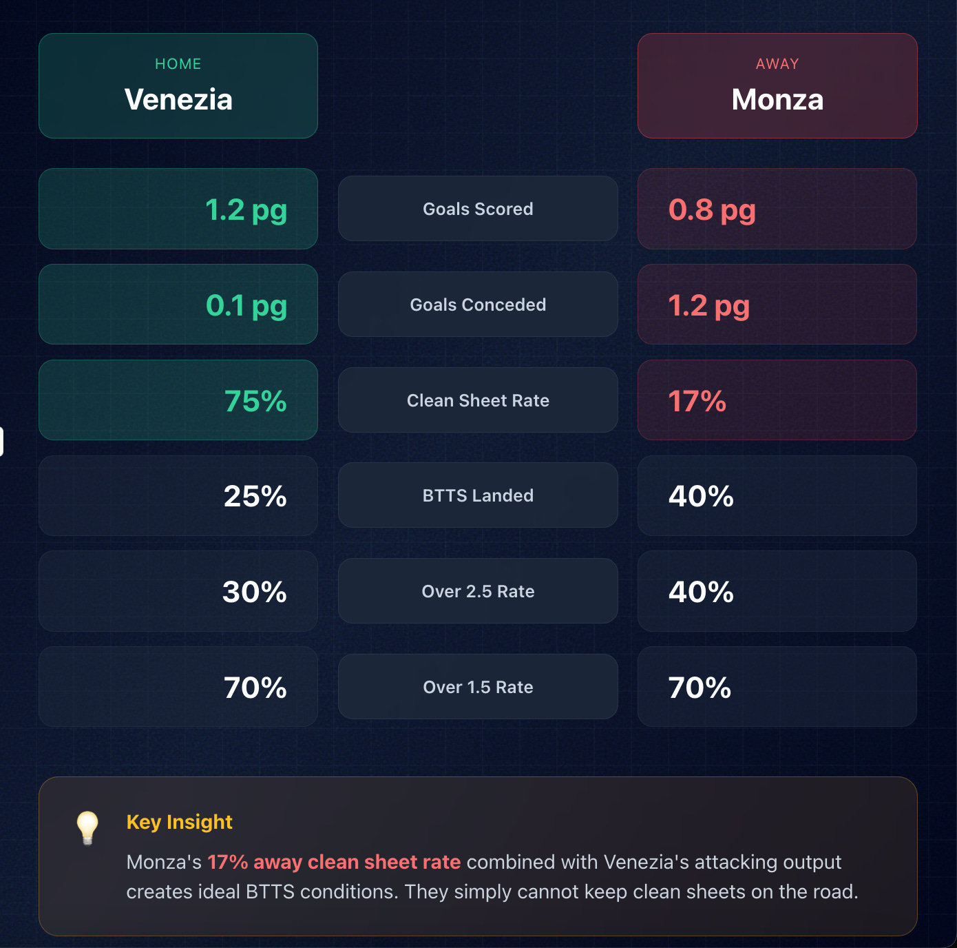 The BTTS probability holds up better because it doesn’t require volume — just one goal from each side. Given Monza’s 17% away clean sheet rate and Venezia’s ability to create chances, both teams finding the net is the more reliable thesis.
