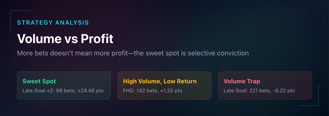 Why it’s working: Higher goal thresholds offer better prices. A late 4.5 entry at odds of 3.50-5.00 only needs to hit 25-30% of the time to profit. When the filter identifies matches with genuine late-game attacking potential, the strike rate has exceeded expectations.
