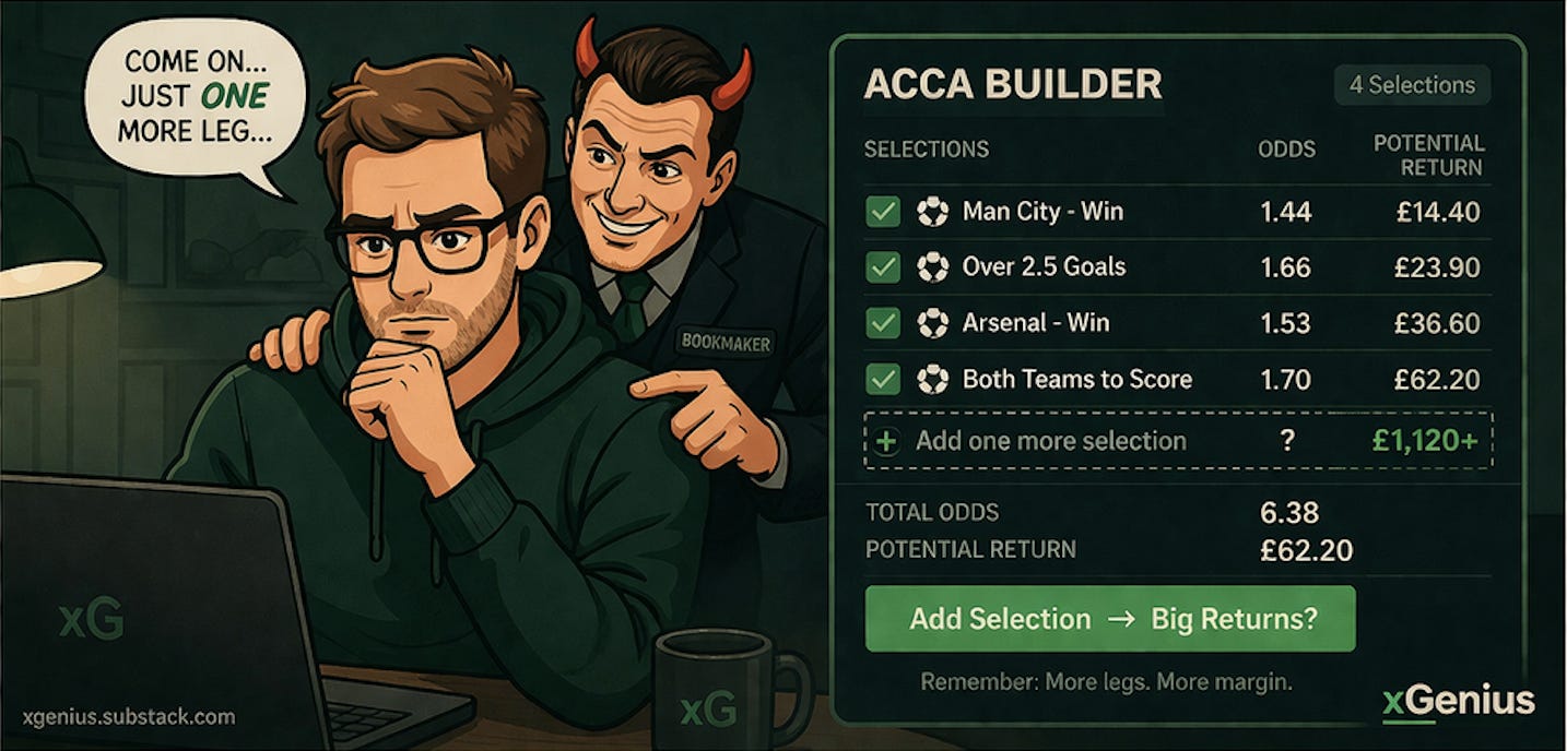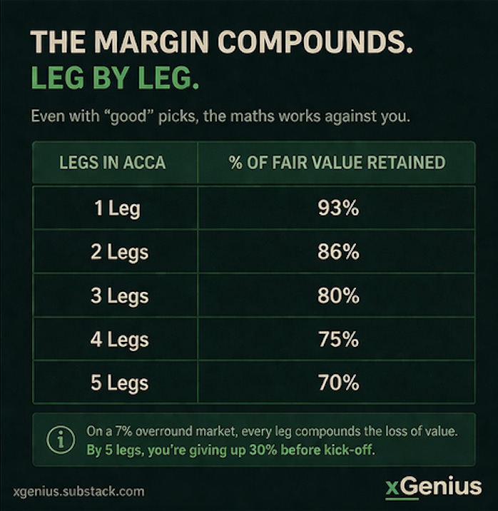 Better selections improve your chances. They do not fix a broken structure. The foundation of any accumulator — the compounding margin across every leg — needs to be understood and accounted for before the selections are even assessed.